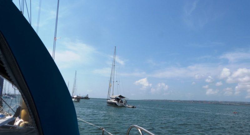 Samedi 5 Octobre ; essai de décoller vers 7h mais panne guindeau ! remonter doucement les 30m de chaine ! aller c’est parti pour les 16 miles à faire et atteindre l’ile de Bali ! Le courant nous pousse à 8 nœuds alors que le vent est presque absent ! Dans la « Marina » en fait on est en bout de port où des bouées ont été mises je suppose pour les rally ! On en profite !