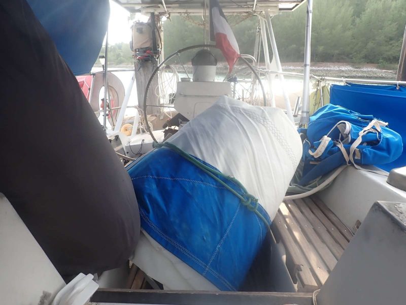 Mardi 1 Avril 2026 ; Descendre et plier les voiles tout seul , pas un gars pour m’aider ! voiles pliées mais pas optimum, surtout le génois il ne rentre pas dans son sac !